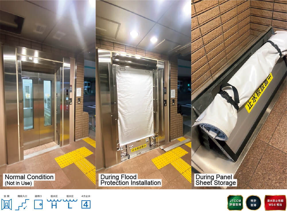 ・During low flood levels, the sheet can be rolled up, allowing evacuation by stepping over the panel.After evacuation, the sheet can be quickly installed.