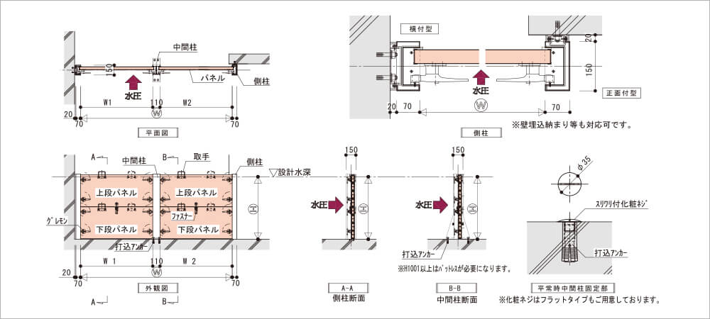 | 浸水高 | 推奨段割 | 柱間最大寸法 |