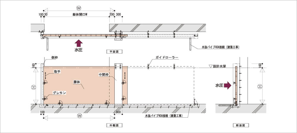 | 扉体表面材 | アルミ(低水圧時)、ステンレス(高水圧時) |