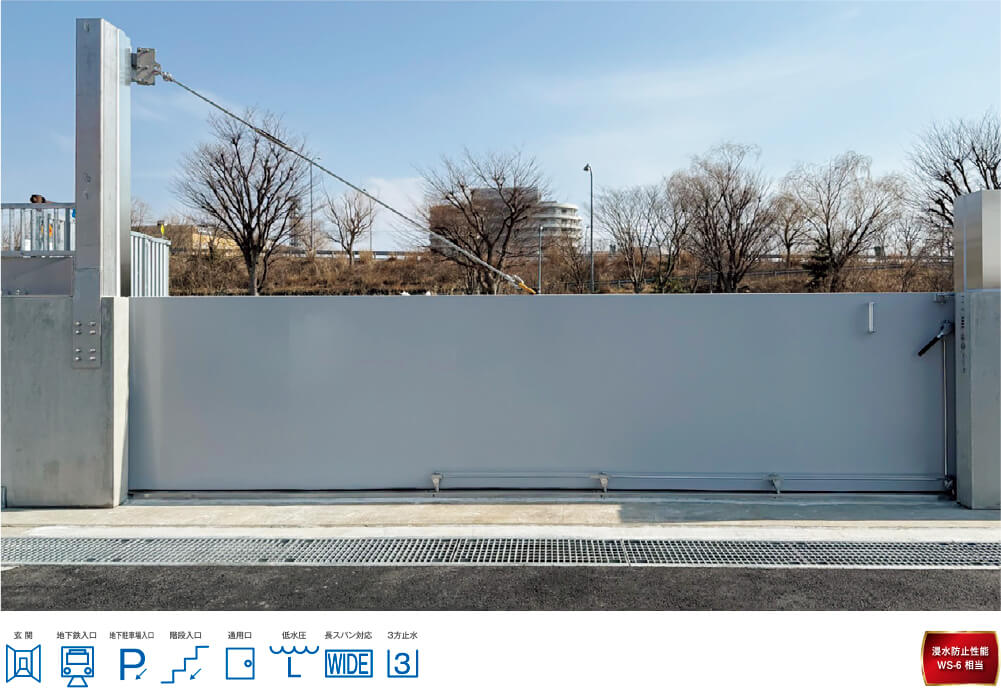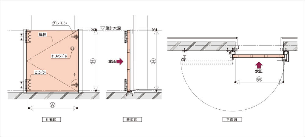 | 扉体表面材 | アルミ(低水圧)、スチール又はステンレス(高水圧) |